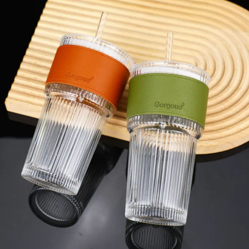 لیوان اسموتی دور چرمی ۶۰۰ میل شیشه ای نی دار