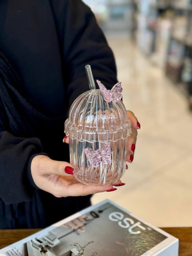لیوان اسموتی نی دار شیشه ای درب دار اکرولیک