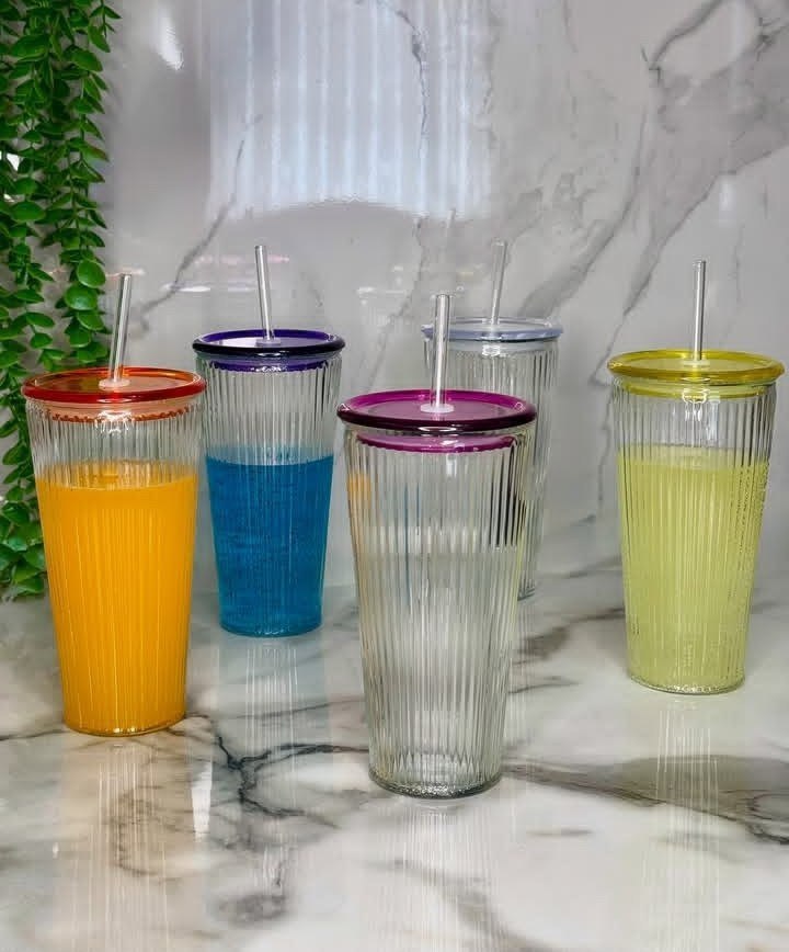 لیوان اسموتی نی دار شیشه ای درب دار اکرولیک
