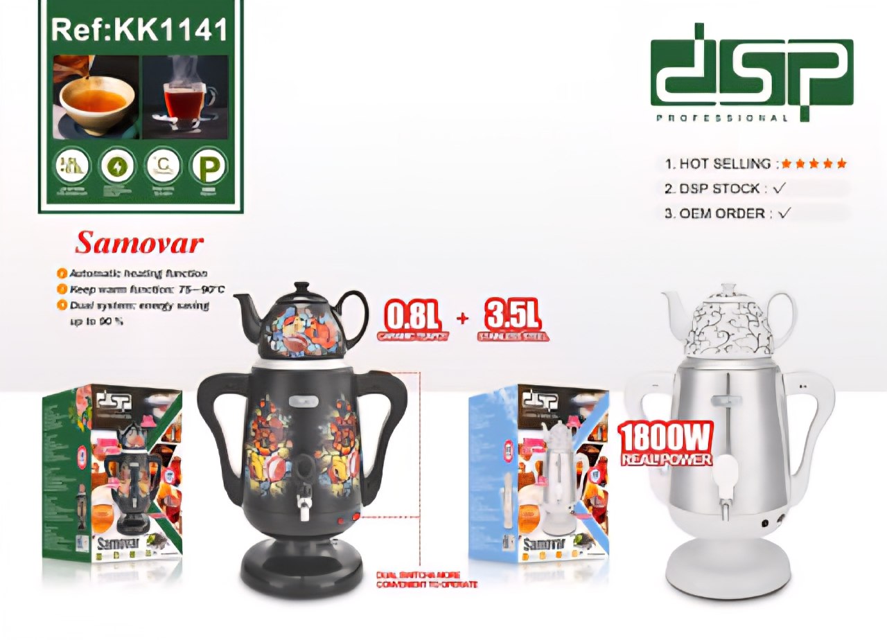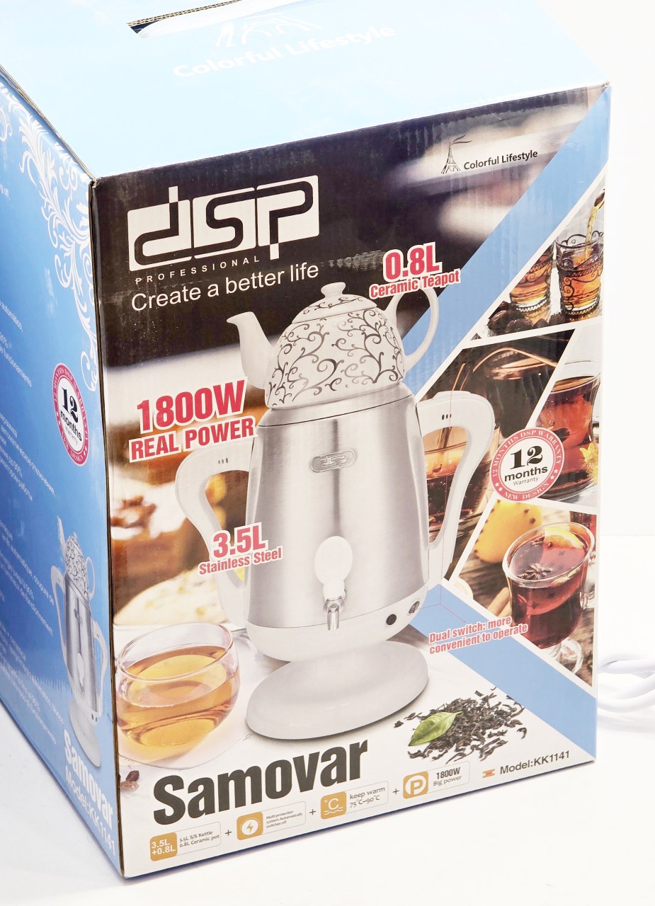 ✅ سماور برقی استیل DSP 🔺code:1141 🔺1800 وات 🔺سماور 3.5 لیتری 🔺قوری چینی ۸۰۰میلی لیتری 🔺گرمایش اتومات 🔺ساخت چین 🇨🇳