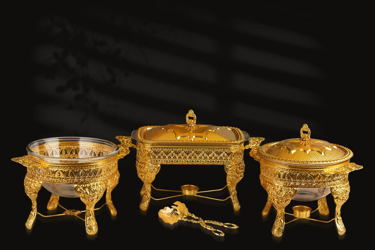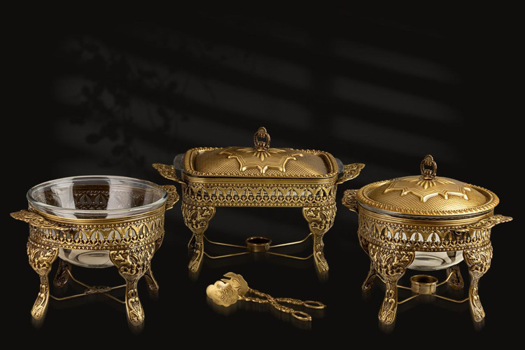 سرویس سوفله خوری طرح لاله در سه رنگ طلایی و نقره ای و آنتیک آبکاری رنگ ثابت