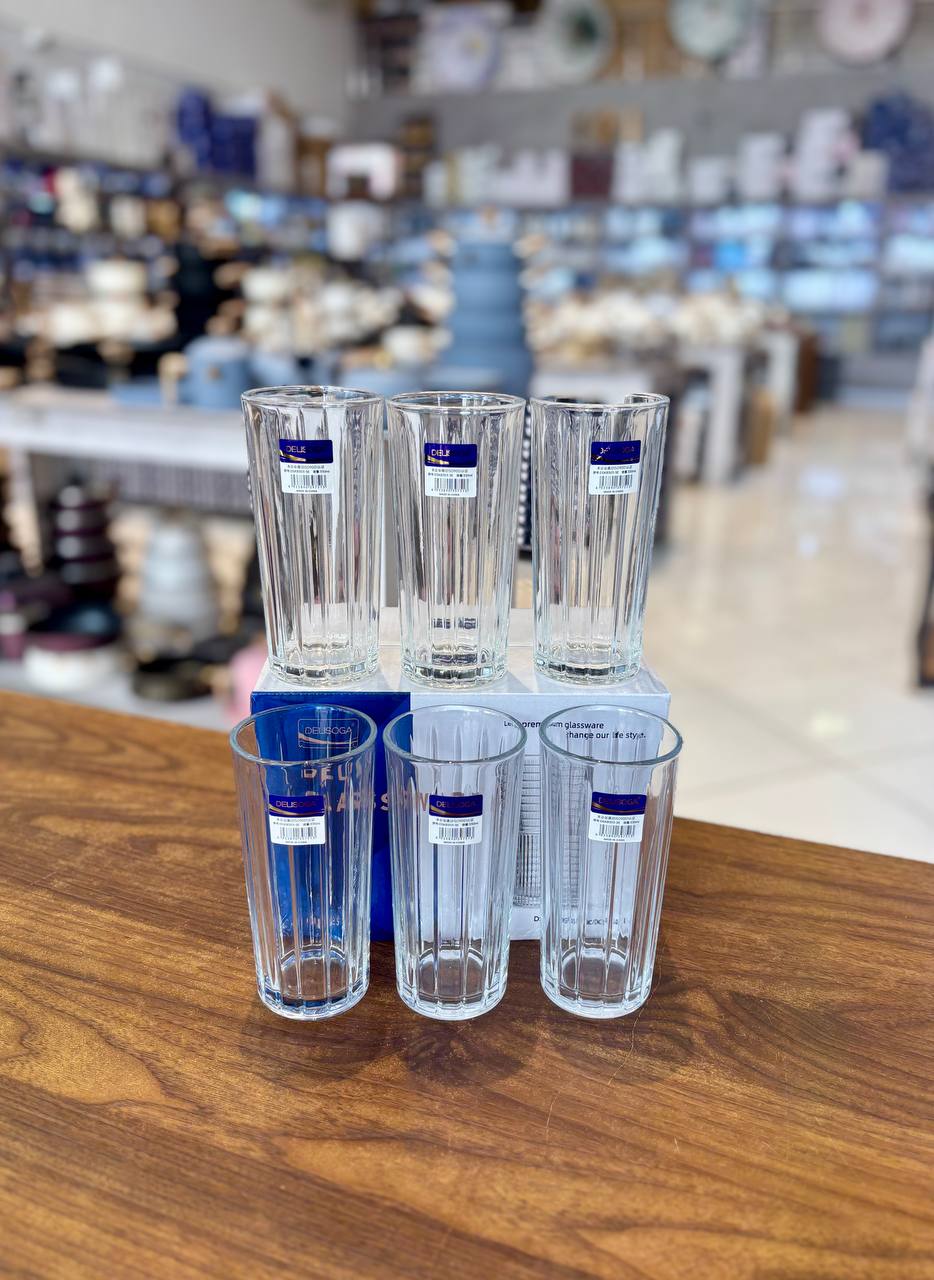 لیوان بلند DELI GLASS وارداتی🇨🇳🇨🇳 کد محصول: KIT-1365 پک 6 عددی گنجایش: 330 میلی لیتر ارتفاع: 15 سانتی متر قطر دهانه: 7 سانتی متر
