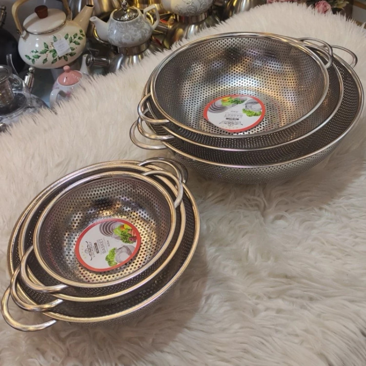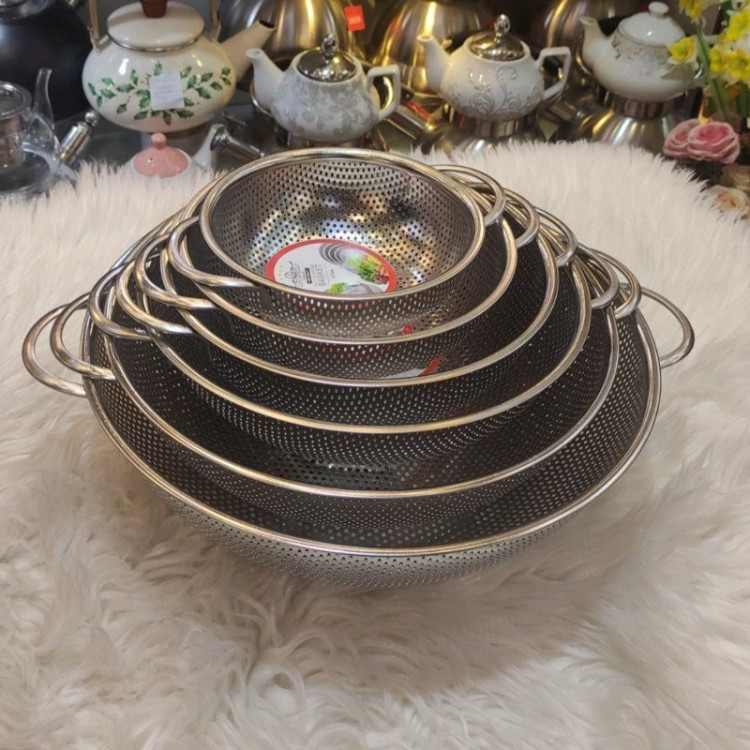 آبکش استیل دسته دار وارداتی با کیفیت عالی استیل ضد زنگ درجه یک 6 پارچه از سایز 16/5 تا سایز 32/5