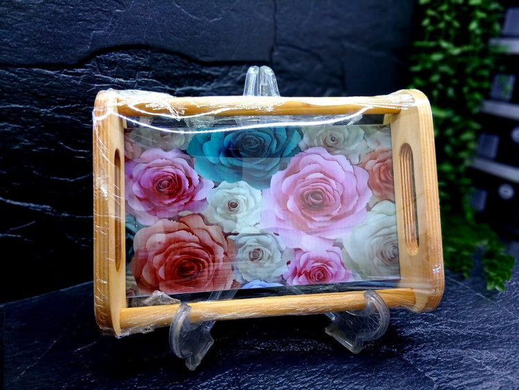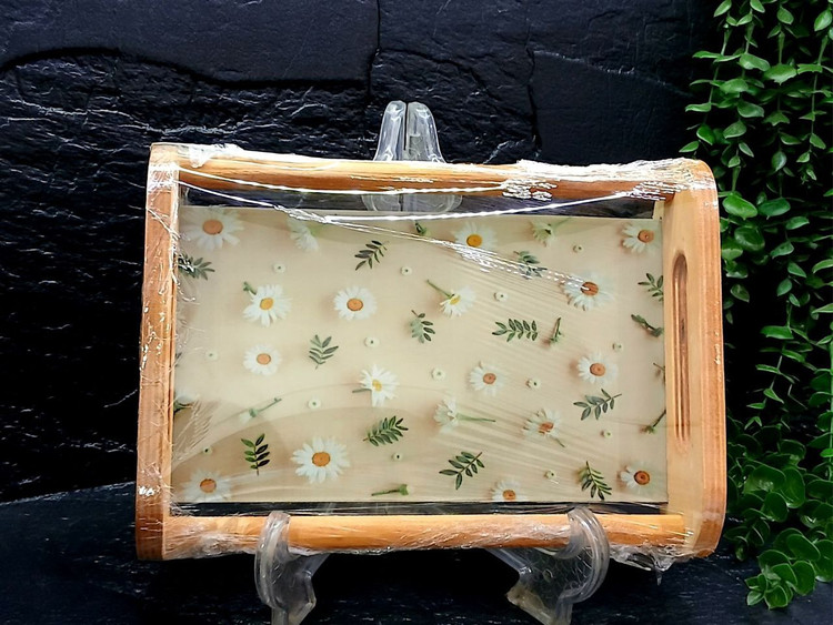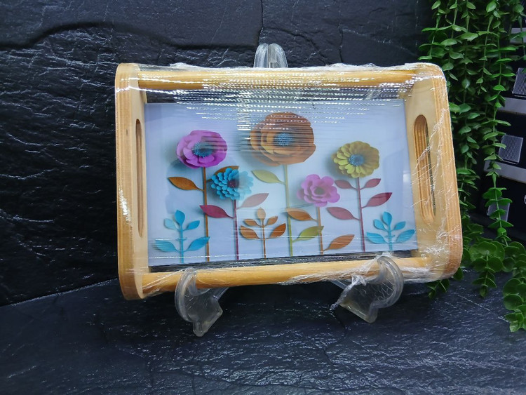 سینی دسته چوبی بامبو کف شیشه طرح دار سایز کوچک
