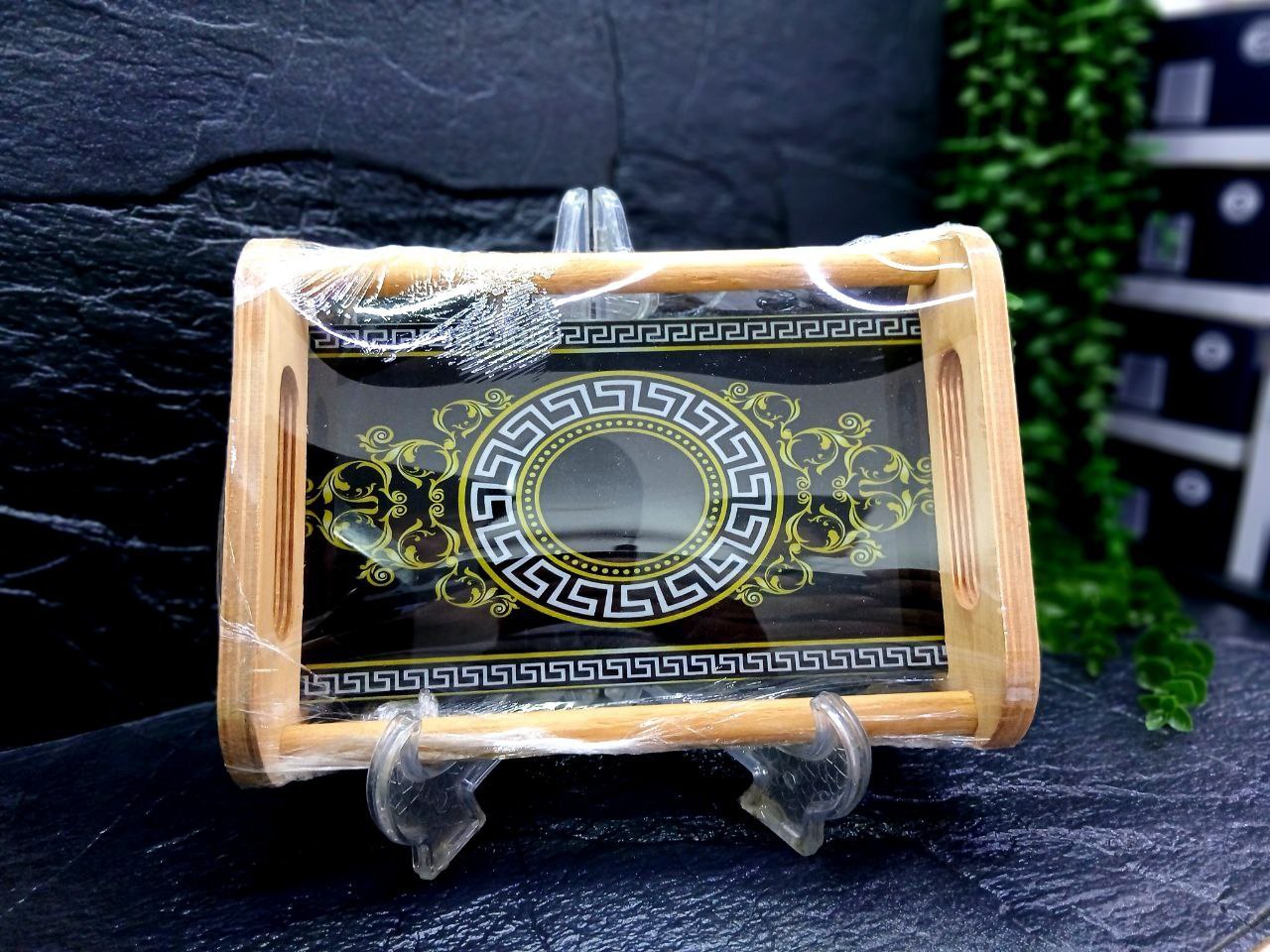 سینی دسته چوبی بامبو کف شیشه طرح دار سایز کوچک